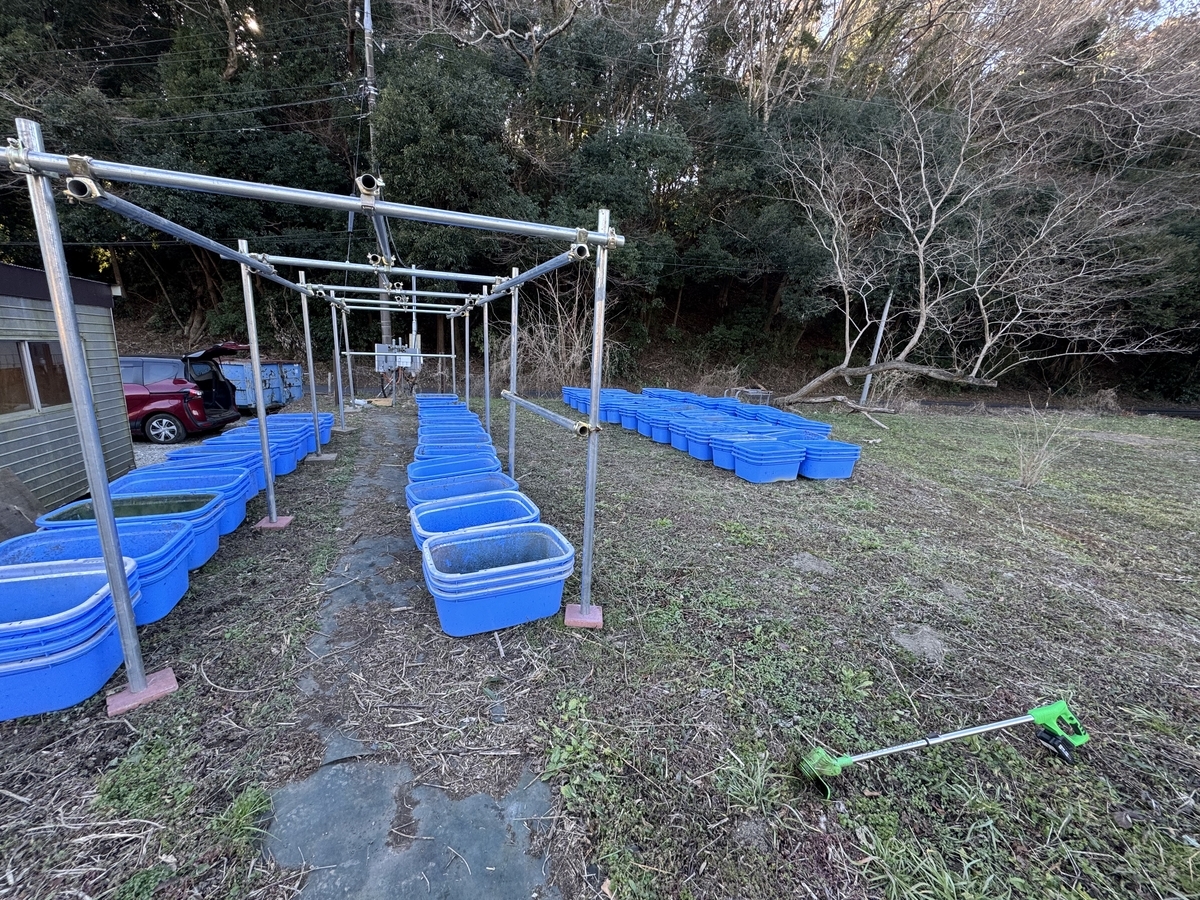 まだ339個の80リットル水槽、3つのプラ舟、さらに3つのFRP池が残ってます。