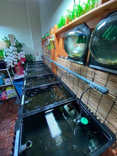 堀切めだかの入り口わきにあるオーバーフローろ過システムの水槽7本。 ここは自家産魚を中心にみゆきなどの大衆魚を1匹300円で販売しています。オーバーフローシステムなので水槽の見た目以上に魚を密飼いしても大丈夫。水はとてもきれいです。魚も元気。展…