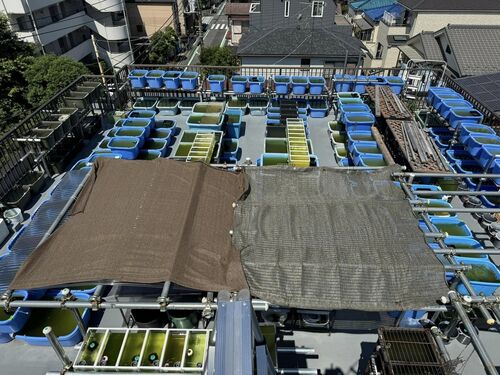 60リットル以上の池や水槽だけで1600個以上、そのサイズ以下の小型容器も含めると2000個。それを葛飾区堀切と千葉市若葉区の2か所を3名(私、サチコ、ケイコ)だけで管理。しかも来年は同じ千葉市若葉区にもう1か所、1000個の80リットル…