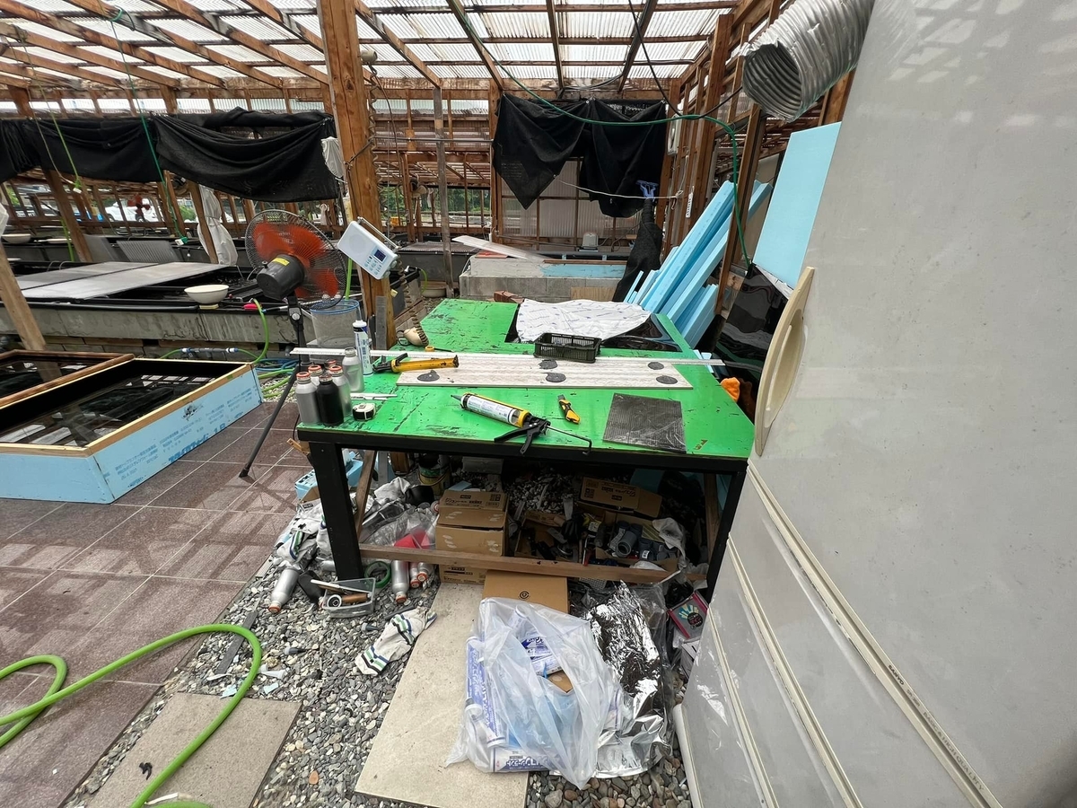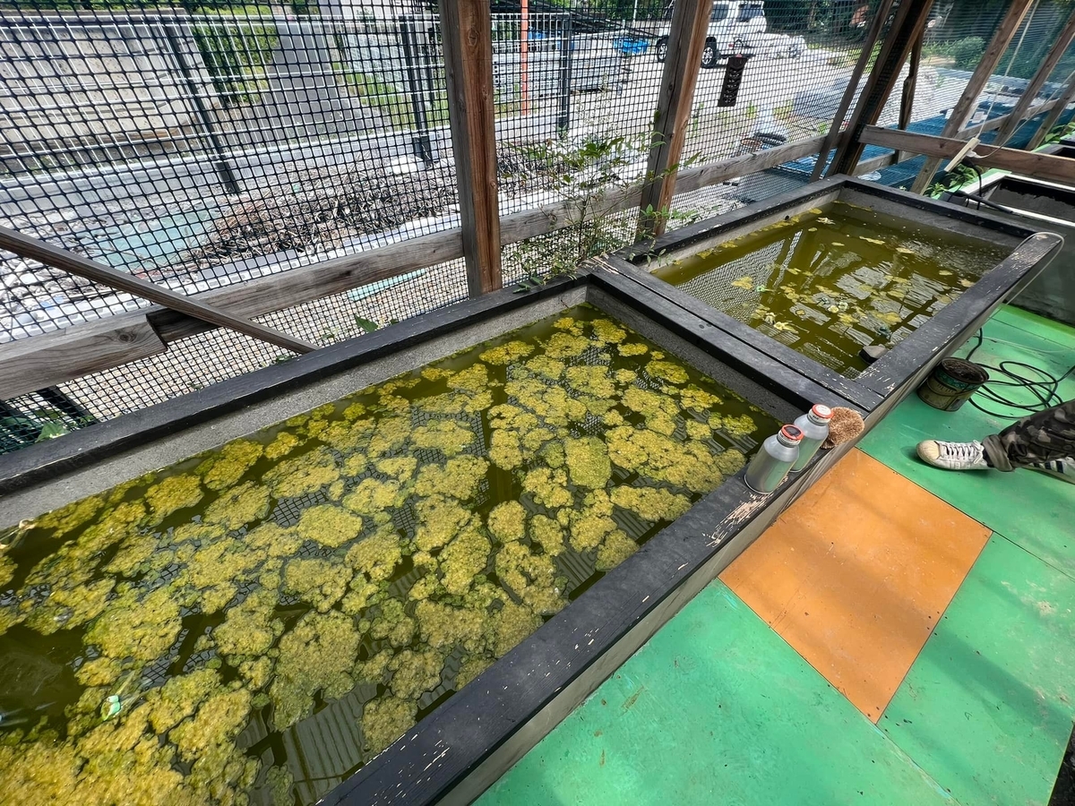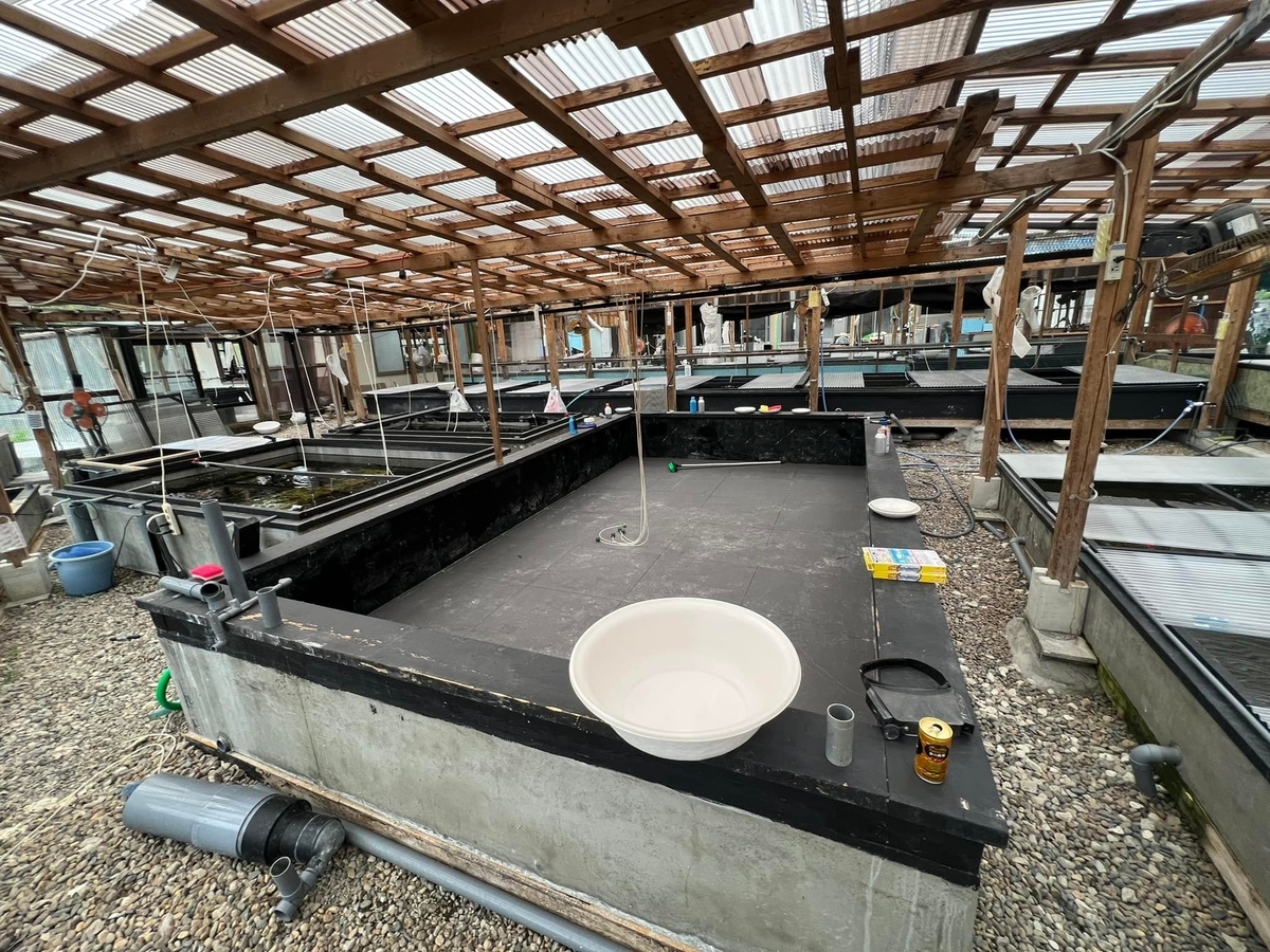 2階には4m×2mの巨大池が4面あるのですが、オーナーさんも手が回らないとのことで現在は未使用。メダカ屋目線でいうと「この時期に、なんともったいない!」