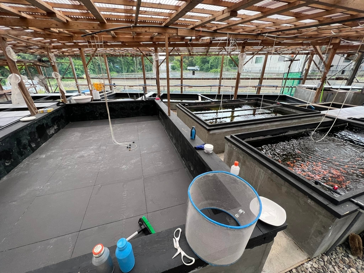 100面以上ある池のほとんどは断熱材とタイルとコンクリートで作られています。小型の池でも500リットル以上、大型の池は2トンクラスまで。