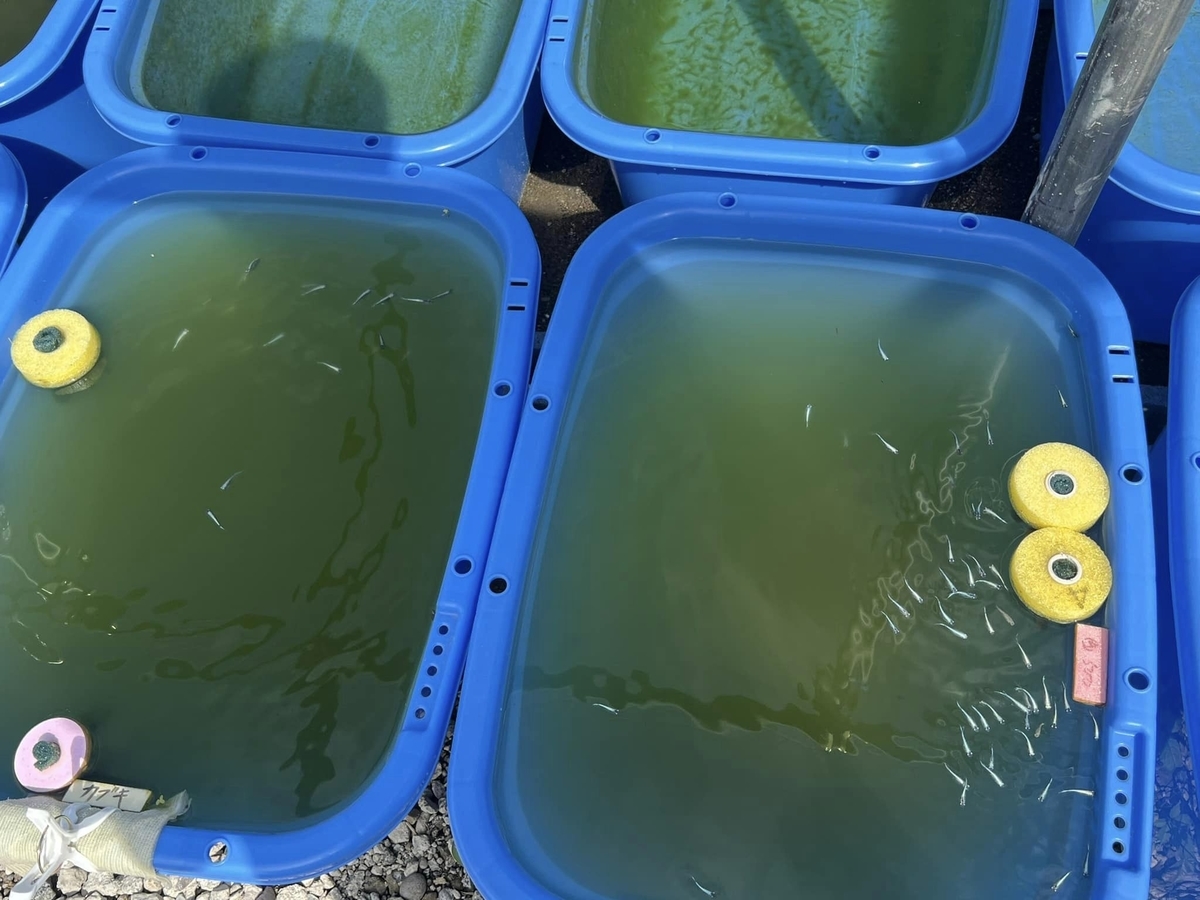 水量の多い池で薄飼いをしているのでメダカたちは本当に気持ちよさそうに泳いでいます。ここはメダカにとって天国です。