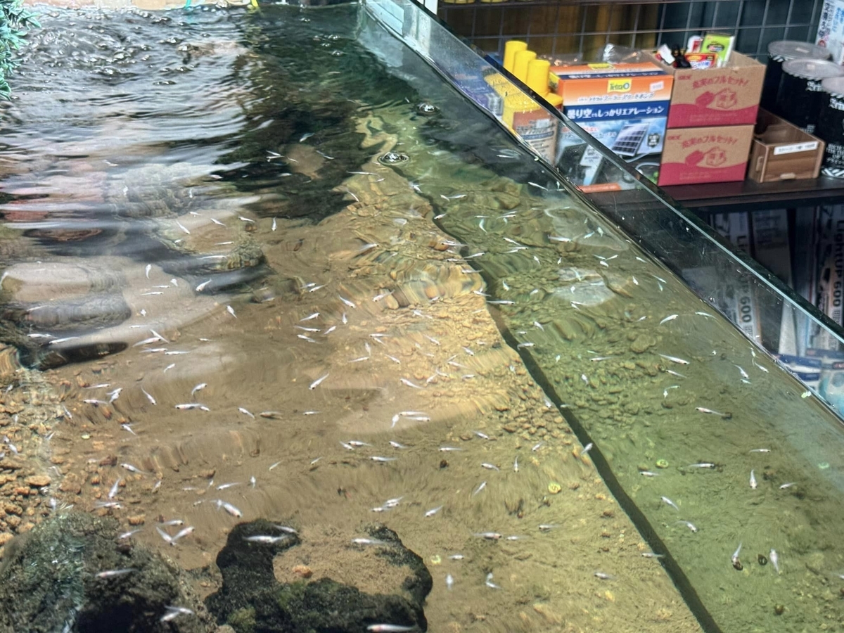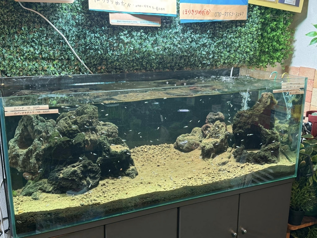 1号店店内にある120cm水槽。1年以上回したフィルターを赤玉土の効力で最高レベルの活きた水が出来上がっています。数百匹のメダカは元気でノートラブル。
