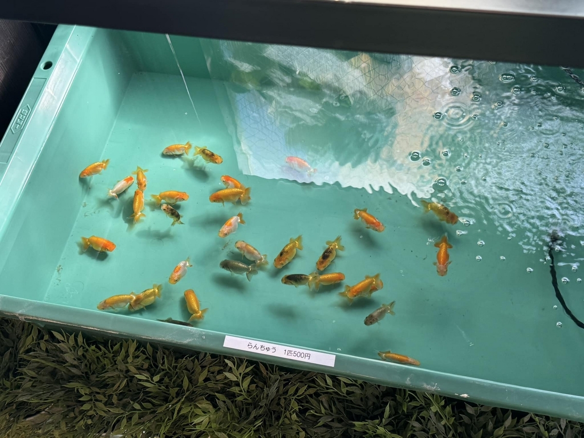 らんちゅうは1匹ごとの体型の良し悪しの差が大きい魚。良いものから順に売れていきます。したがって良いものを選べる入荷直後である今は1匹500円にて。何日か経って半分くらい売れたらその残りは1匹300円に下げる予定です。