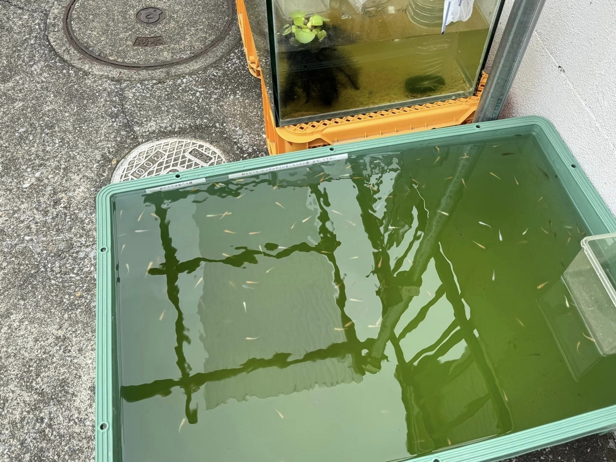 で、夕方現地に行ってみると約200匹ほどのメダカがしっかりと緑の水槽に投入されていました。