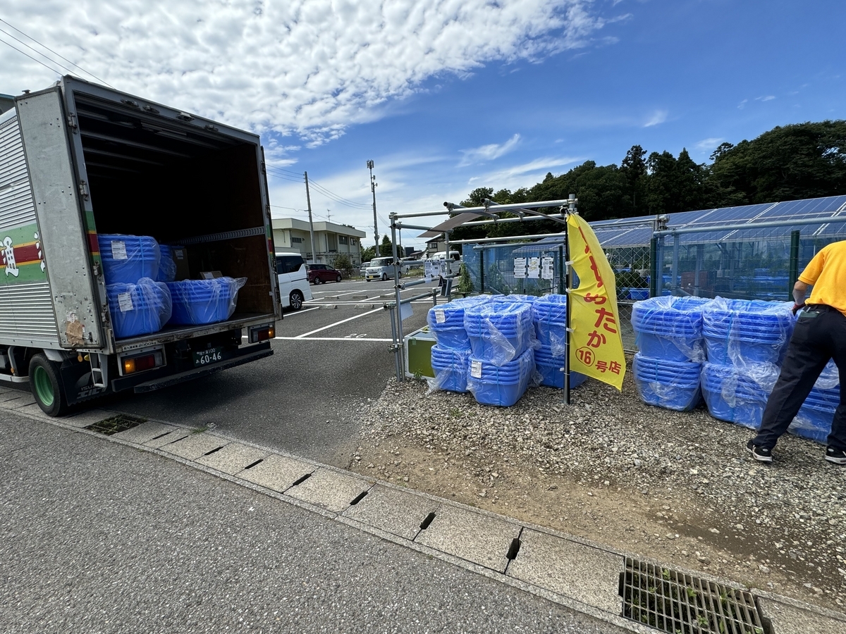 太陽光発電所を活用した千葉第二養魚場に80リットル容器120個が納品されました。真夏日の炎天下。今年1番のハードワークでした。