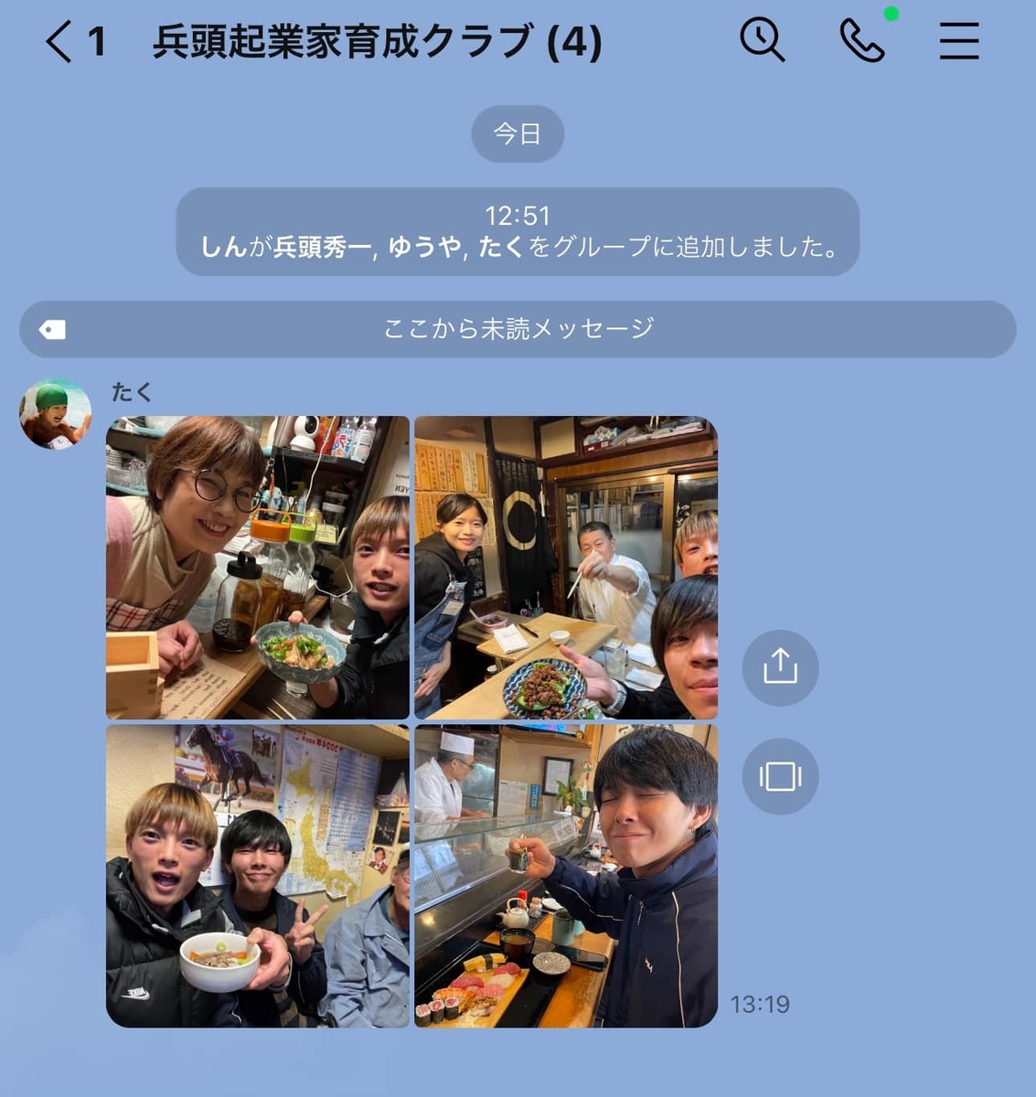 彼らに私とのLINEグループを作るように頼むとそのネーミングが・・・「兵頭起業家育成クラブ」って。ちょっと照れくさいですが、まぁいいでしょう。