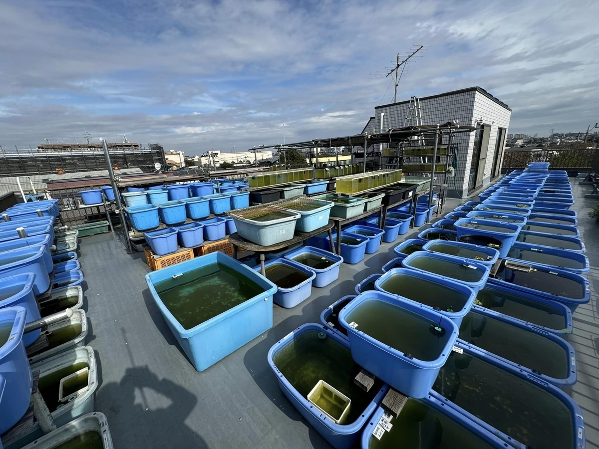 堀切の1号店養魚場では約500個の大型(60リットル以上の)水槽に冬でもメダカが潤沢にいるような、この状態を来年は千葉で3000個の水槽を埋めることが一番の目標です。