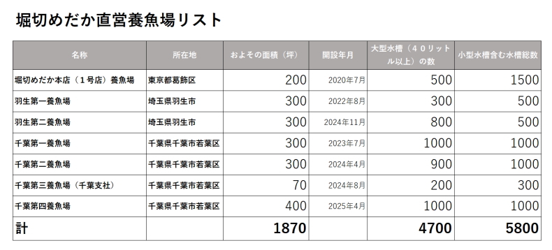堀切めだか直営(株式会社ちかなり所属社員による運営)のメダカ養魚場リストをまとめてみました。数値はいずれもおおよそのものです。