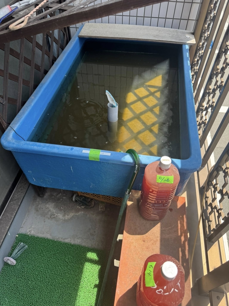 堀切めだか1号店の2階バルコニー。120cm×75cmの大ミジンコ培養池。ミジンコに与えるエサはPSB。これで長期維持ができています。冬は越せています。真夏だけ枯渇します。